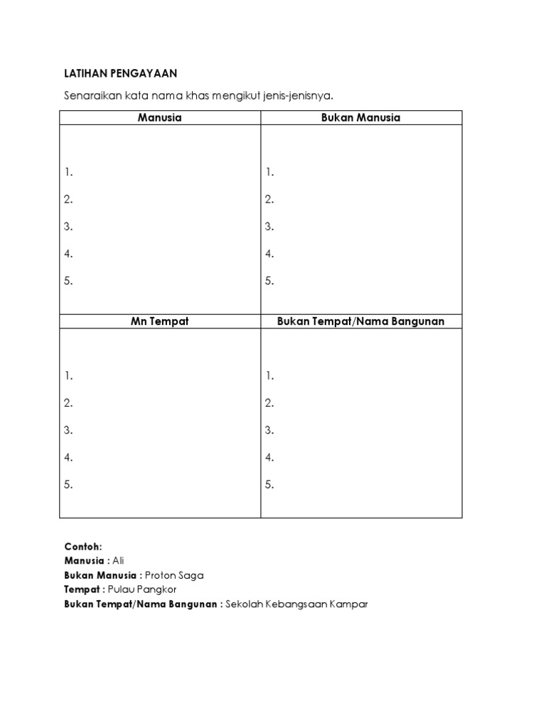 1.ali telah membeli sepasang kasut adidas. Puan min suan membuka pintu lalu masuk ke dalam rumah. Tetap akan berusaha dengan gigih untuk mencapai kejayaan yang. Kata nama ialah perkataan yang boleh menjadi unsur inti bagi binaan frasa nama. Kata nama khas menggunakan huruf besar pada huruf awal.