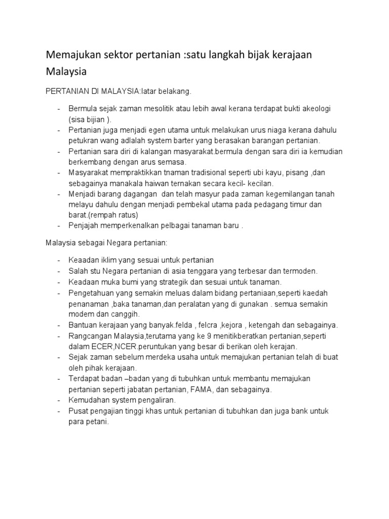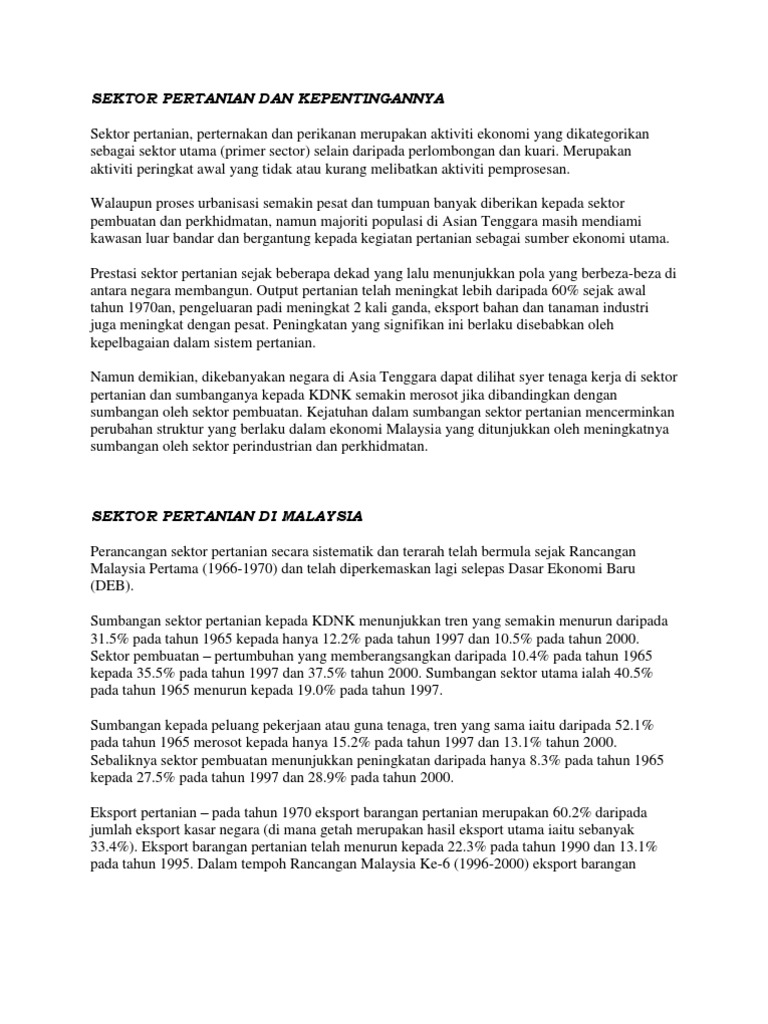 Pertanian di malaysia membentuk dua belas peratus daripada kdnk negara. Pertanian di malaysia membentuk dua belas peratus daripada kdnk negara. Sektor pertanian dan industri asas tani perlu mengalami transformasi untuk menjadikan sektor ini lebih moden, dinamik dan berdaya saing. Johari baharum berkata, kebanyakan komoditi yang diimport tidak ekonomik untuk dihasilkan dalam negara kerana kos pengeluaran tinggi di samping iklim yang tidak sesuai. Timbalan menteri pertanian dan industri asas tani, datuk mohd. Pertanian memainkan peranan yang penting di malaysia. Tambahan pula, industri halal yang semakin mendapat perhatian masyarakat dunia wajar disinergikan bersama sektor pertanian negara yang. Contohnya industri memproses kelapa sawit dan getah asli, memproses koko, lada hitam, minyak kelapa serta industri memproses kayu balak dan kilang perabut. Contohnya industri memproses makanan seperti minyak masak dan industri tayar. Industri perladangan adalah sebahagian daripada sektor pertanian malaysia. Sektor pertanian semakin mendapat perhatian di malaysia sebagai sebuah industri penting pada masa hadapan dalam menghadapi cabaran ketidaktentuan ekonomi dan perubahan iklim. 30 persiaran perdana, persint 4, pusat pentadbiran kerajaan persekutuan, 62624 putrajaya malaysia emel: Enam belas peratus daripada penduduk malaysia bekerja melalui sejenis pertanian.